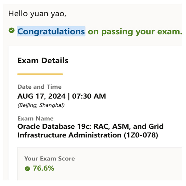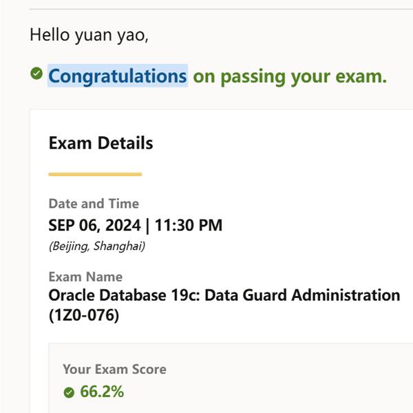 号主姚远目前已经拥有Oracle的认证超过20个了,最近又考了两个Oracle 19c的认证,是RAC和DataGuard。其实内容和12c没有太大的区别,但题目依然很难,很多选项模拟两可,需要对相关概念非常清楚才能通过考试。姚远的运气不错,以超过及格线不多的分数通过了考试。